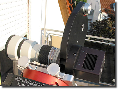 | Objektiv mit Kamera und Filterrad auf der Montierung. |